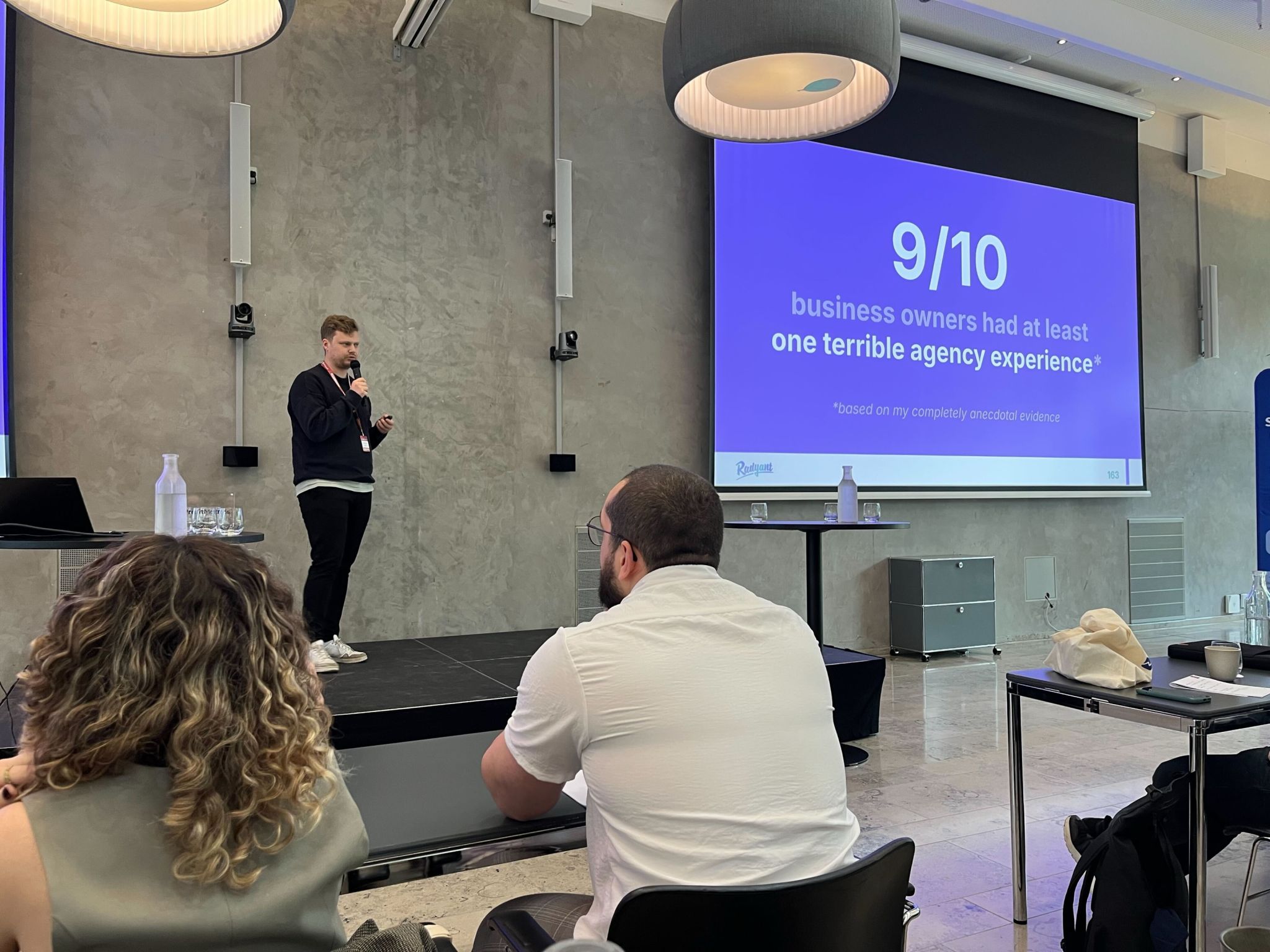 Niklas Buschner (Radyant) gaf een eerlijke kijk achter de schermen van zijn agency-reis, inclusief bijna-faillissement. Zijn lessen vormen een blueprint voor future-proof agencies. Hij hield daarnaast een spiegel voor aan de zaal: waarom hebben zoveel ondernemers slechte ervaringen met bureaus? Volgens hem komt dit door drie structurele kernprincipes die bureaus niet op orde hebben: