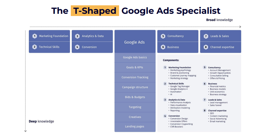 Miles McNair trapte af met een inspirerende talk over het gevaar van “Google Ads tunnel vision”. Door de opkomst van automation, AI en smart bidding verliezen veel specialisten hun onderscheidend vermogen. Zijn oplossing? Word een T-Shaped Google Ads Specialist: iemand die Google Ads beheerst, maar ook aanvullende skills zoals CRO, SEO, data-analyse of automation ontwikkelt.